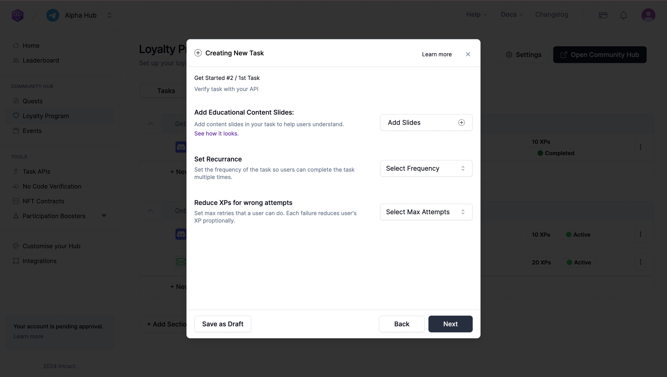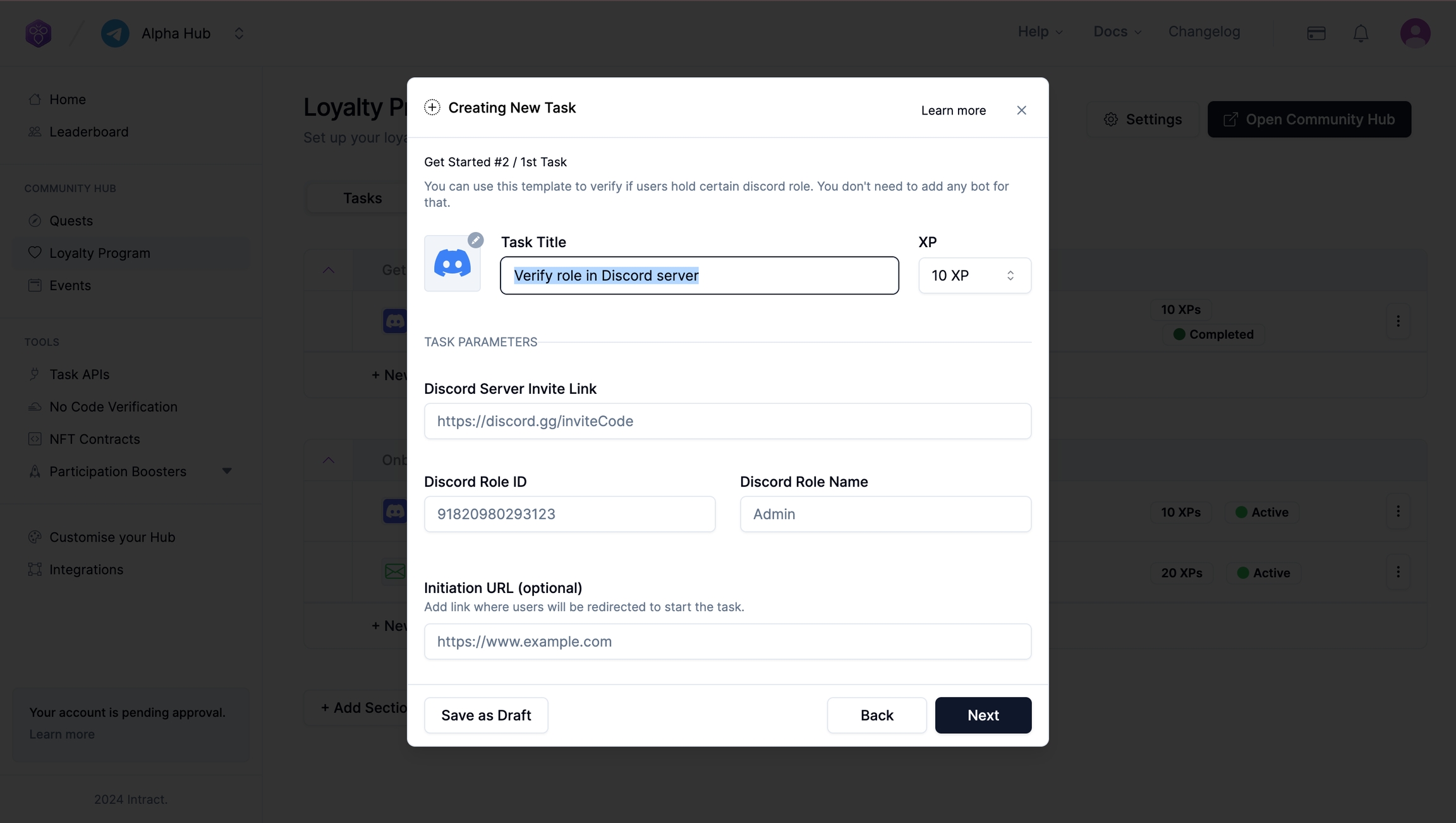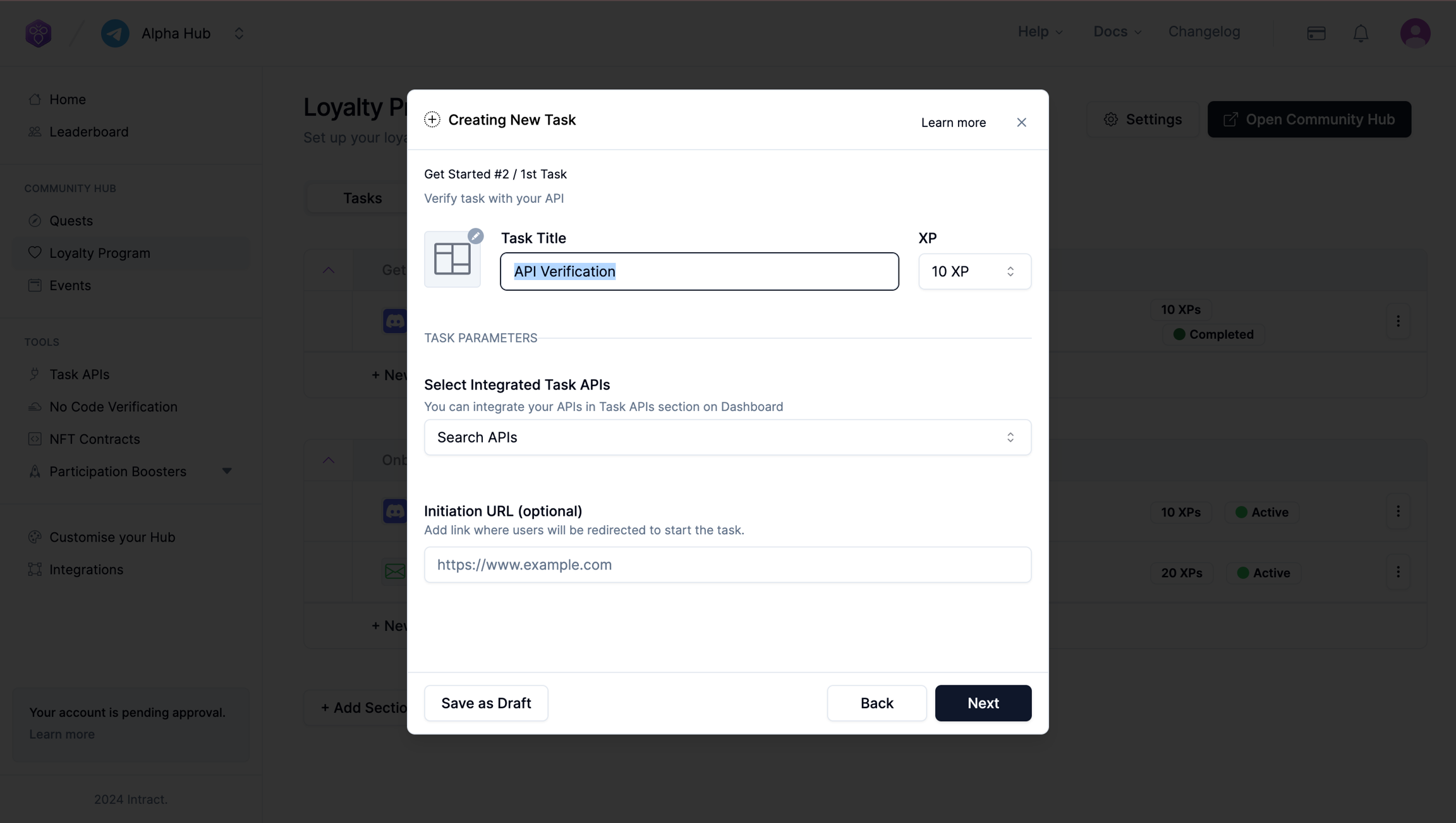 If you've already integrated the APIs, that's fantastic! Now you just need to add a task title, decide how many XPs you want to award per completion, select the API for task verification, and add an optional initiation link. This is where your users will be directed to complete the task.