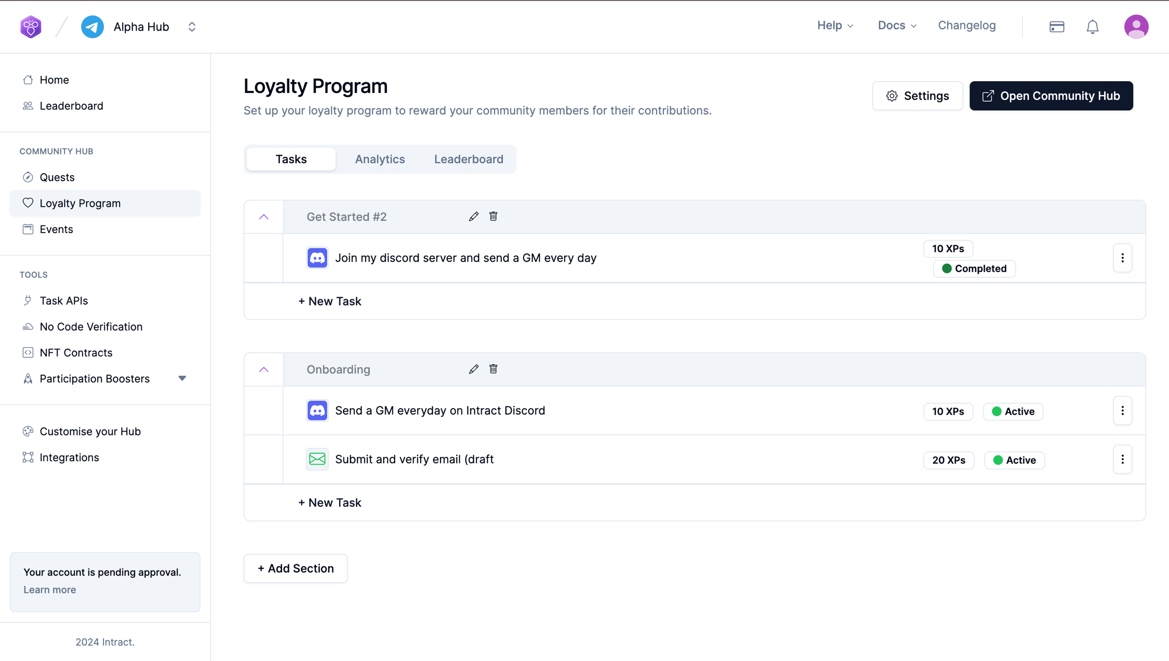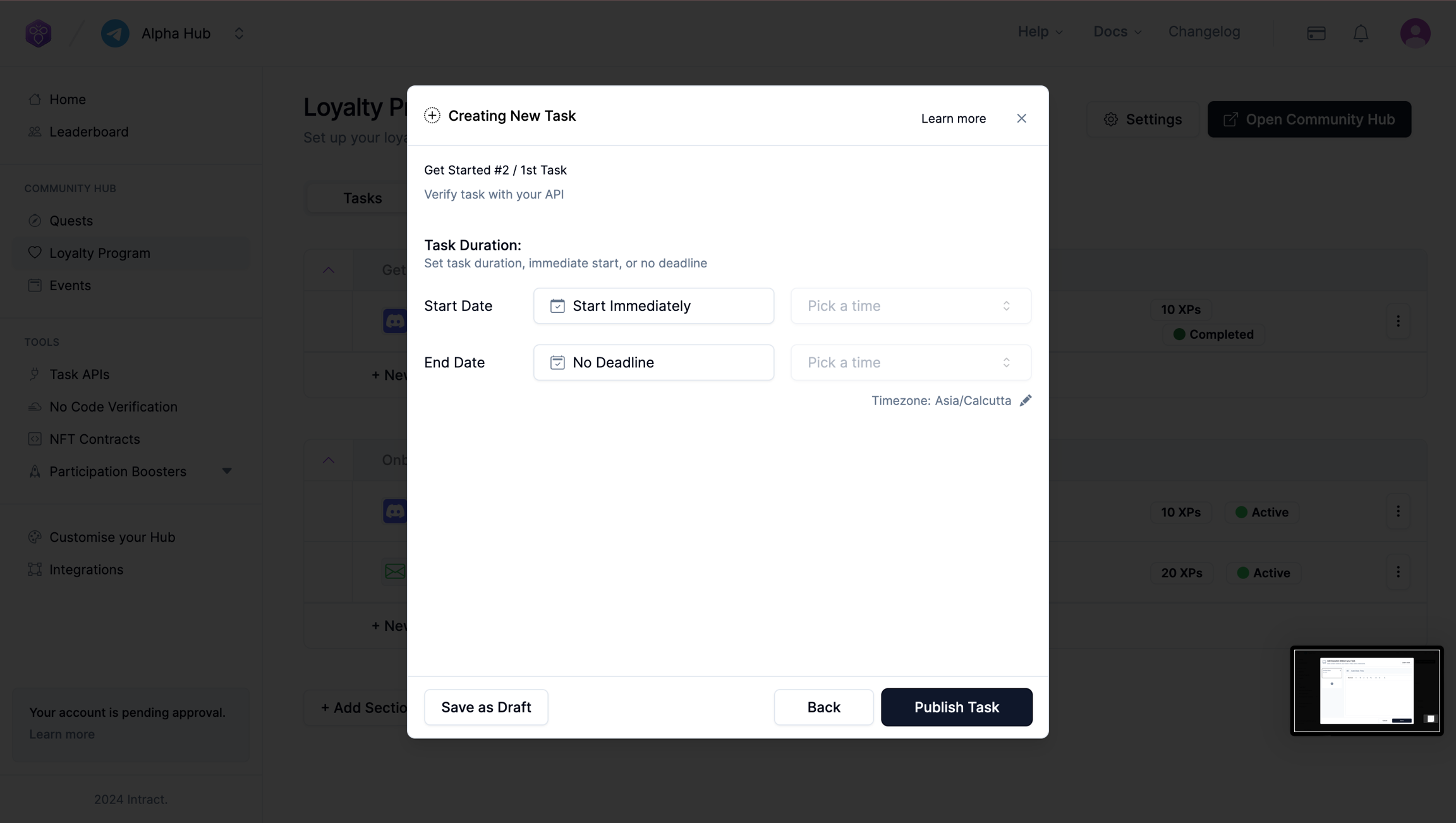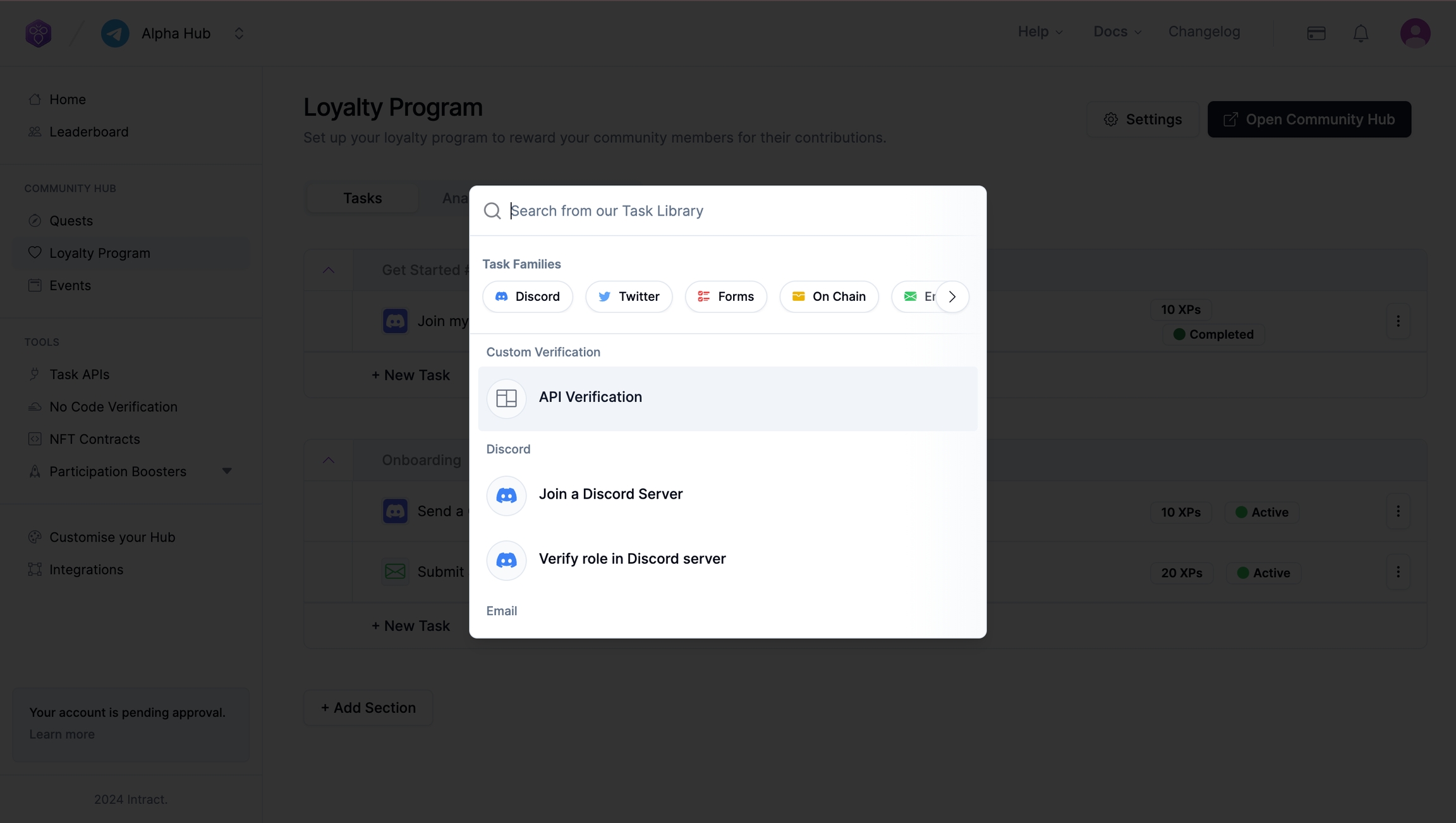 If you've already integrated the APIs, that's fantastic! Now you just need to add a task title, decide how many XPs you want to award per completion, select the API for task verification, and add an optional initiation link. This is where your users will be directed to complete the task.