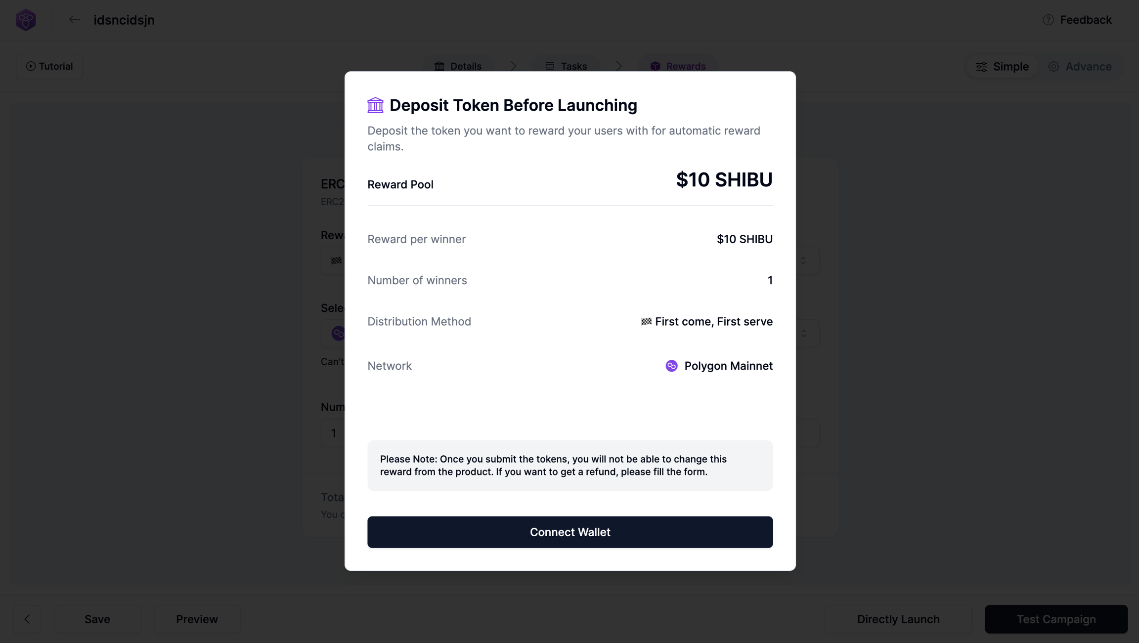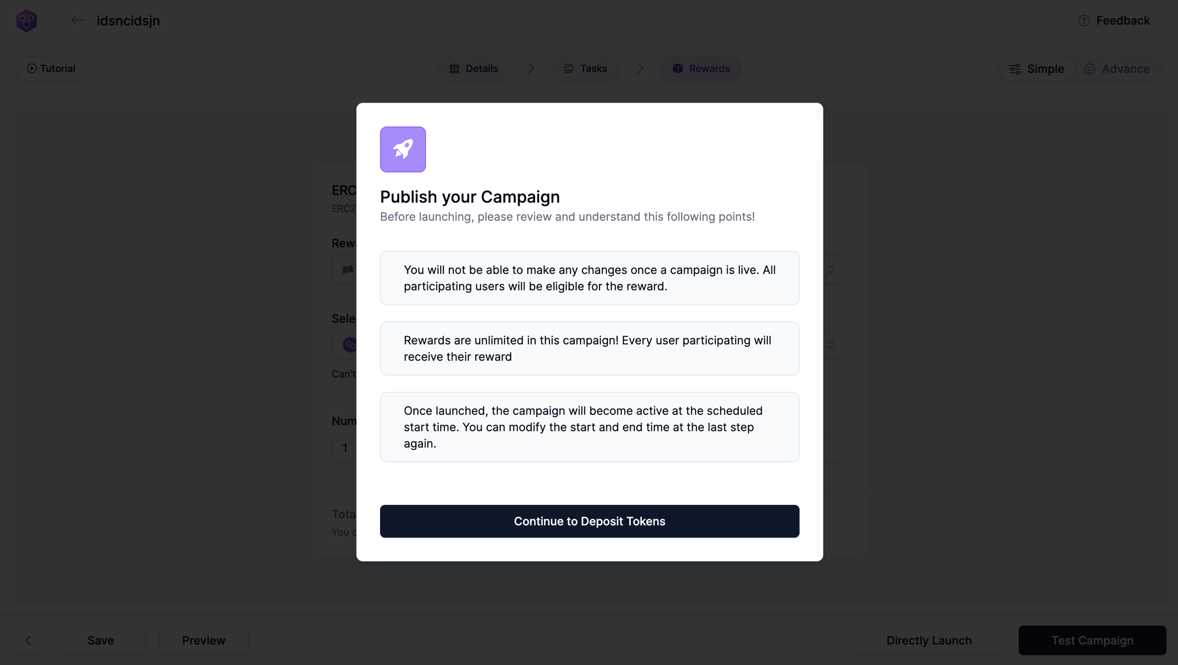 Hit 'Launch Quest' with an ERC20 token as the reward. You'll then be asked to deposit those tokens. Please note, once you've made this move, you cannot make any changes to the campaign. This includes campaigns that are scheduled for a later date.
