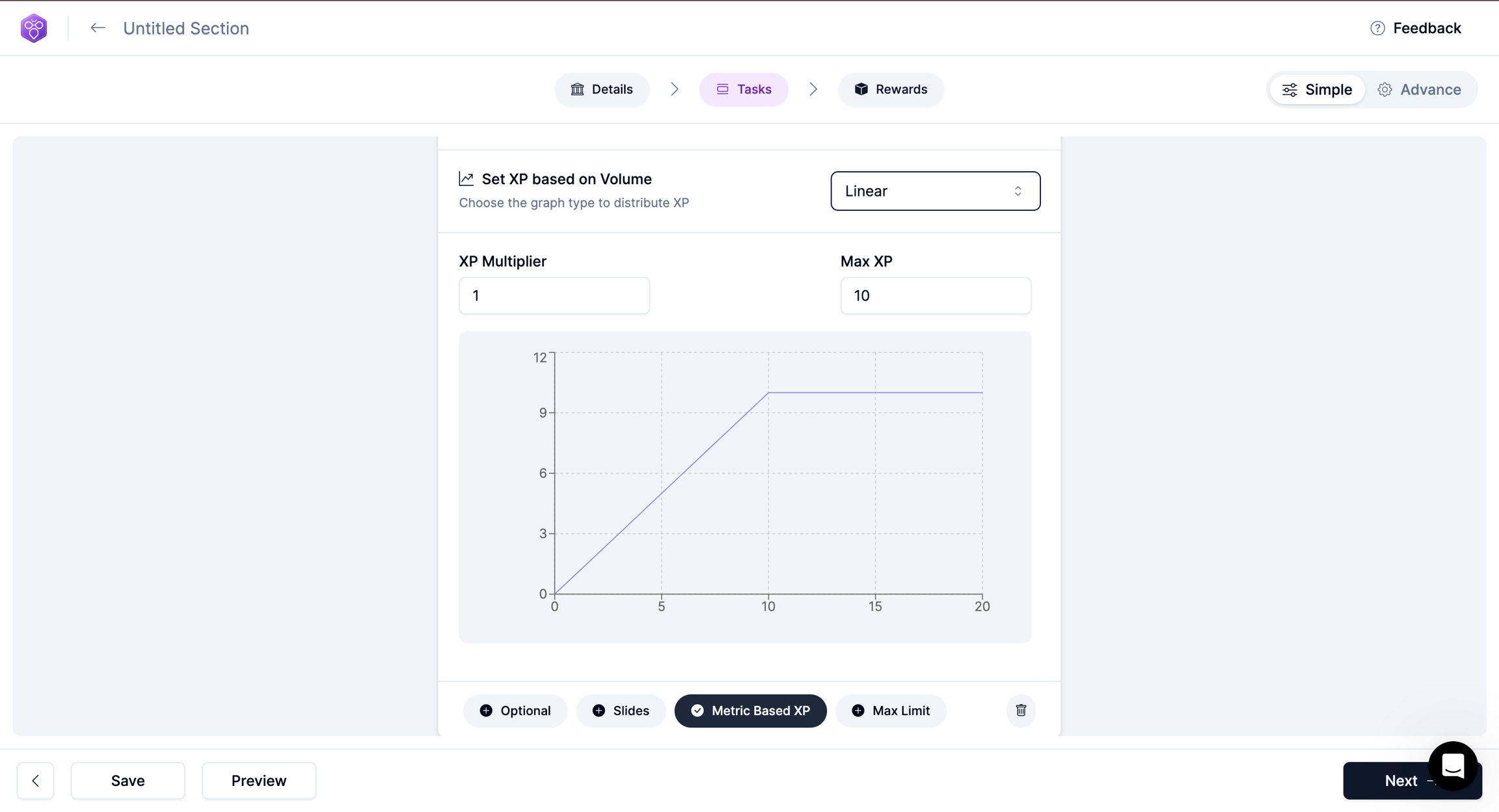 Set an optimal value for the volume, the Max XP a user can earn for the task, and a rate of increase.