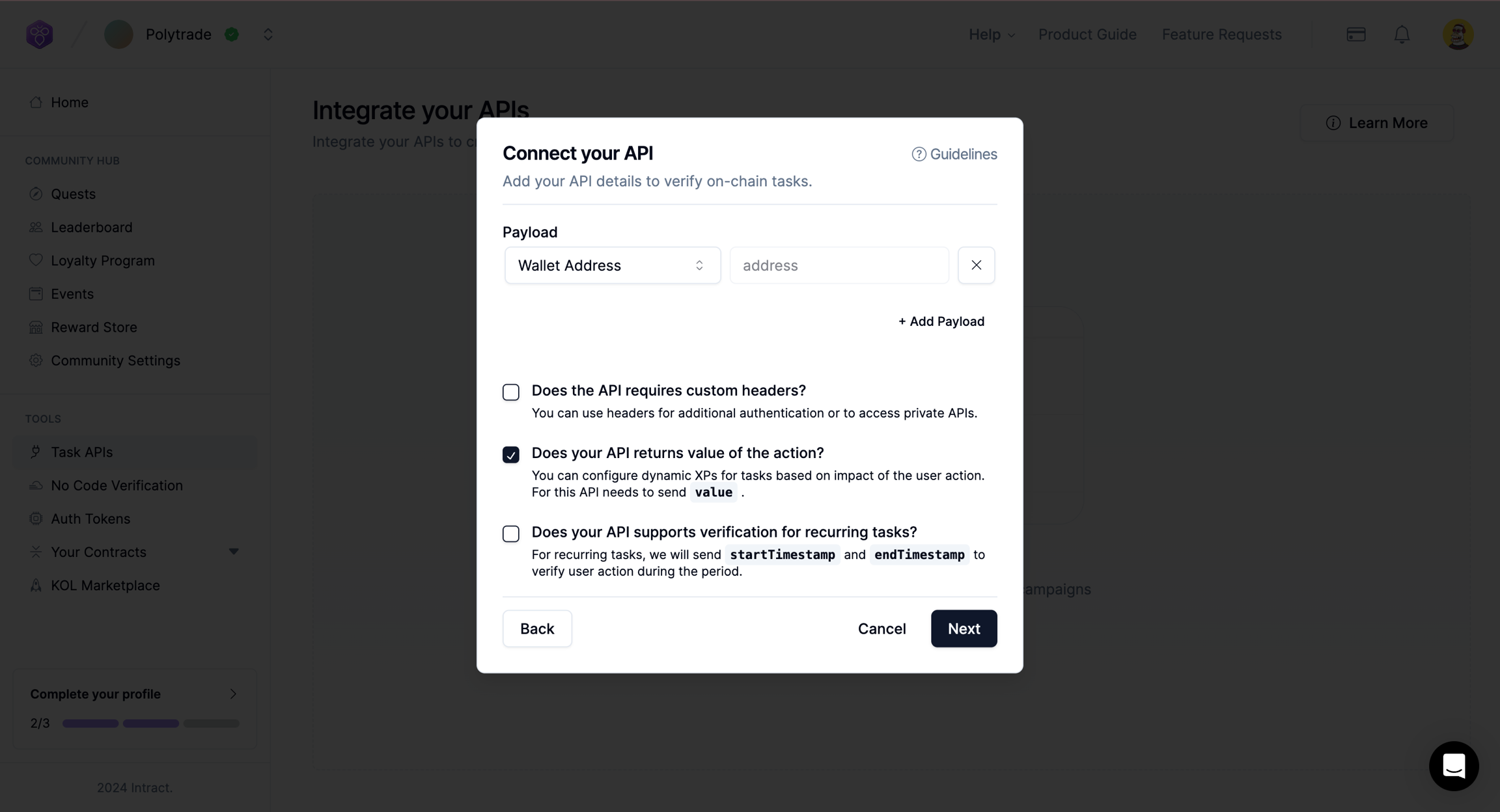 In the task setup section, choose "verify task with your API" and select the API you just integrated.