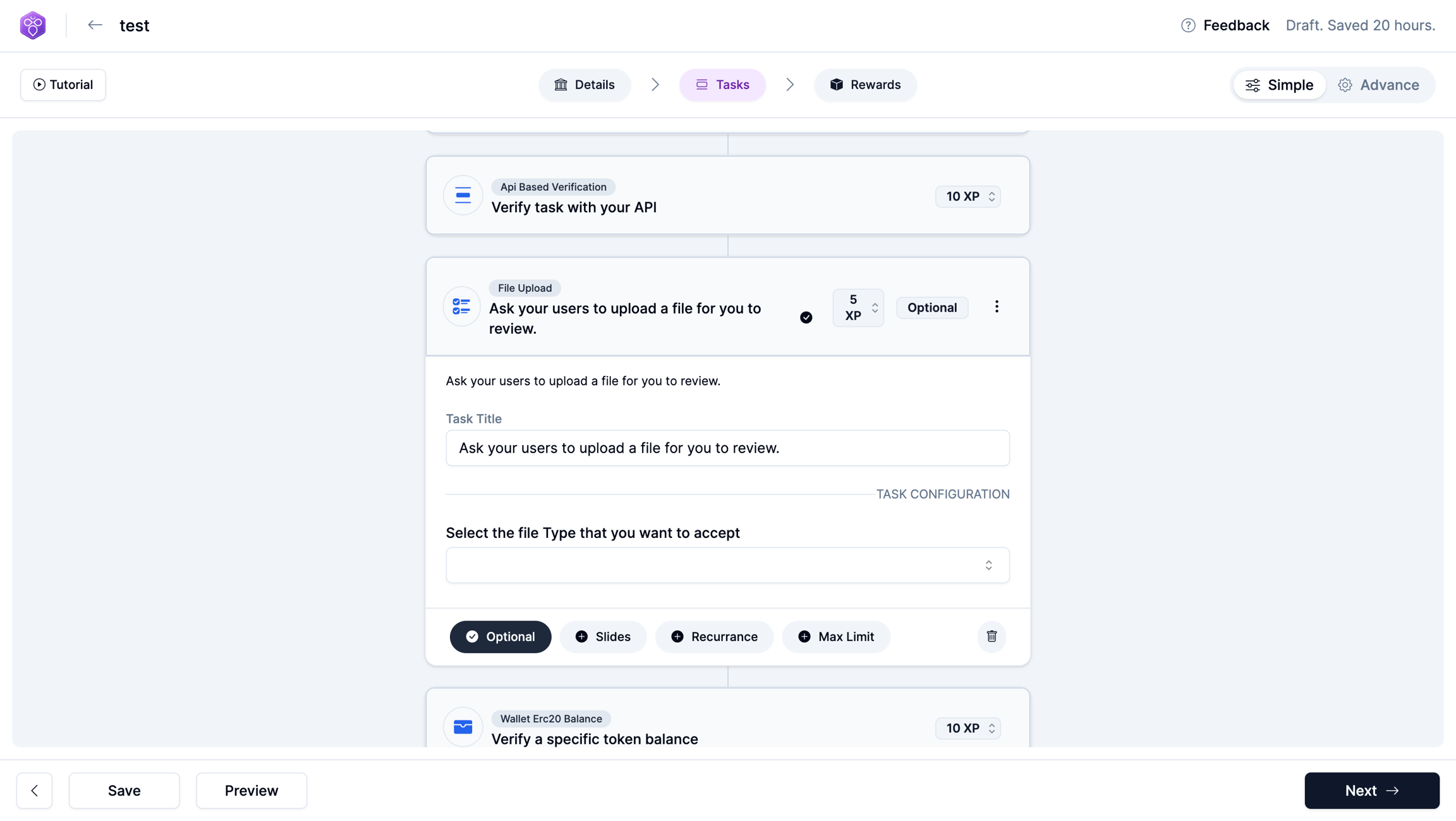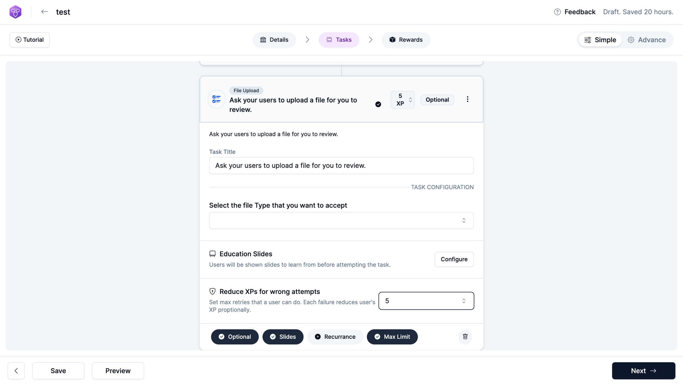 This task feature is also not available for all tasks. What it does is allow you to set a maximum number of attempts a user can make to complete a task. Each incorrect attempt reduces the amount of XPs they will receive. Therefore, ensure that the XPs allocated for a task are divisible by the maximum limit, as we only distribute whole XPs.
