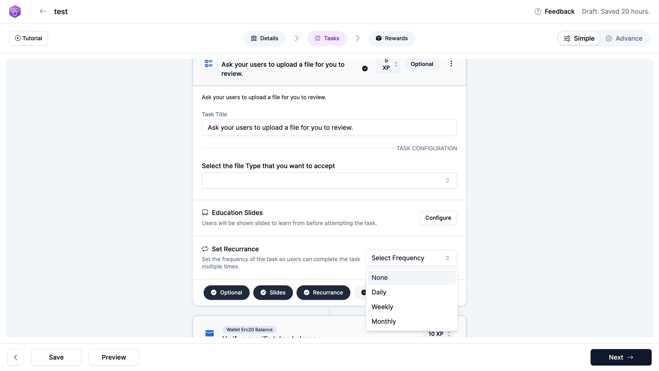 You can set certain tasks to recur. However, keep in mind that not all tasks can be repetitive. For instance, you can request a user to visit a website daily, but you can't ask them to follow the same Twitter handle every day. Some actions can only be performed once. Technically, they can be repeated, but doing so doesn't make a difference. You can set the recurrence frequency, allowing the user to execute the task daily, weekly, or monthly, depending on your selection.