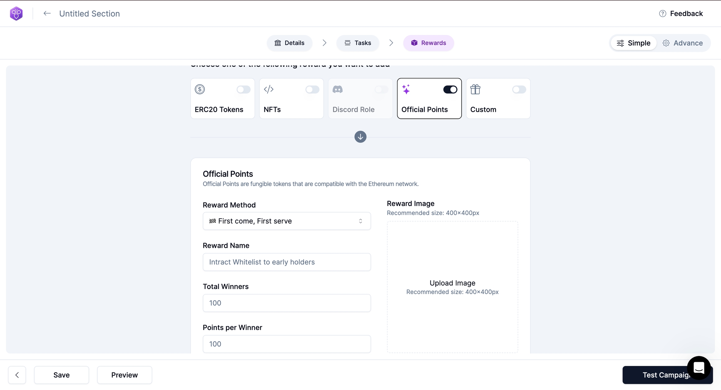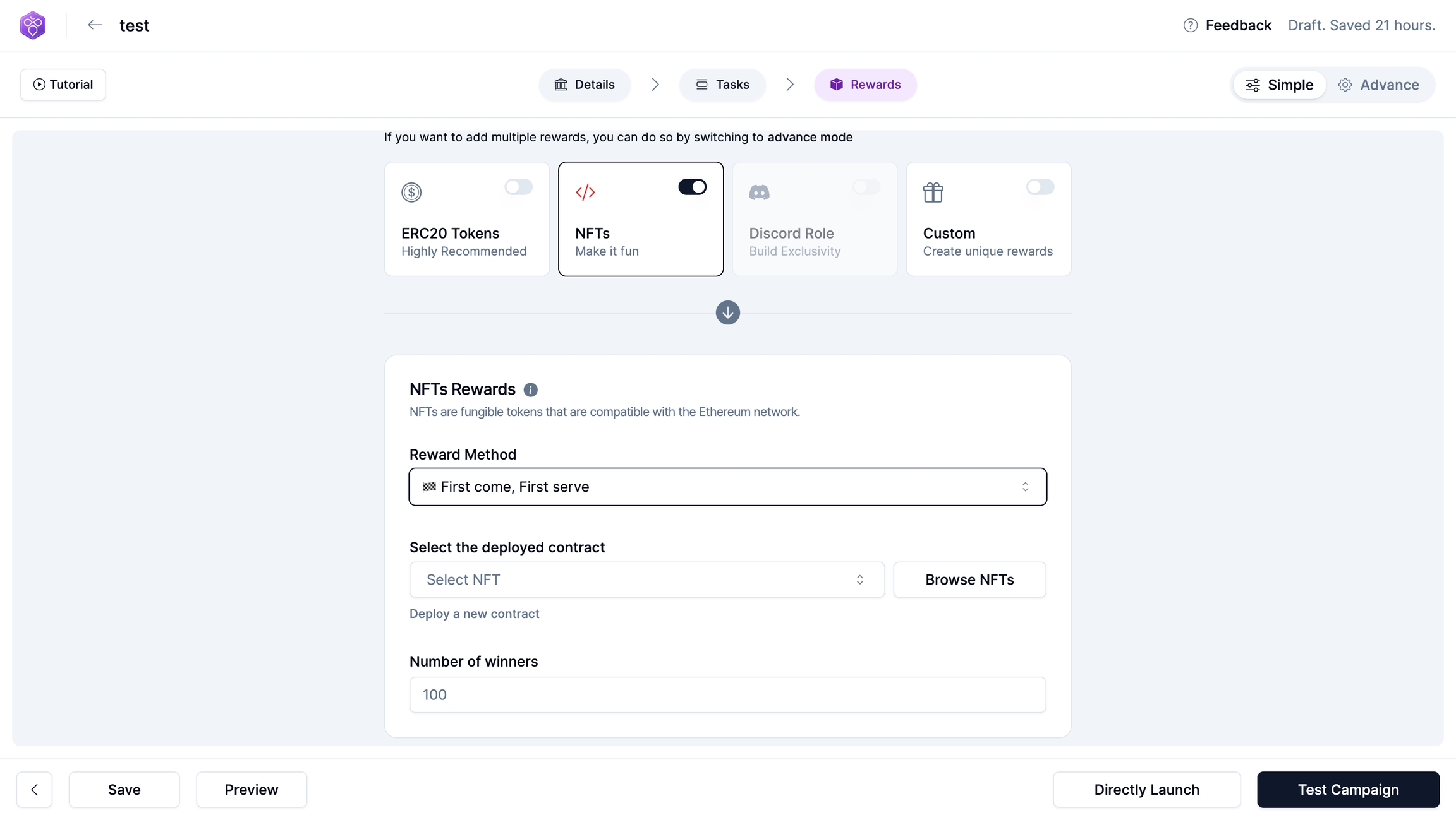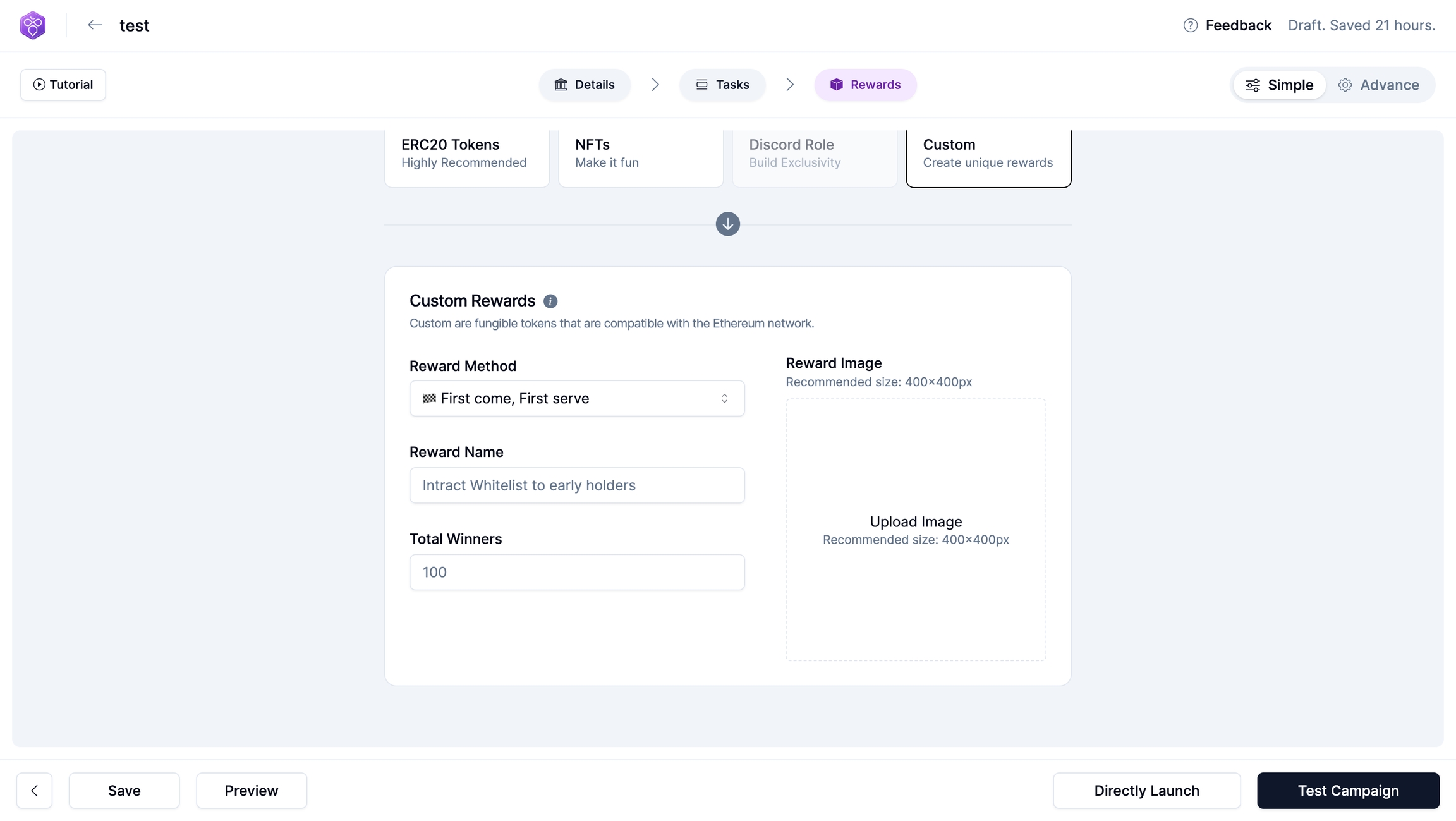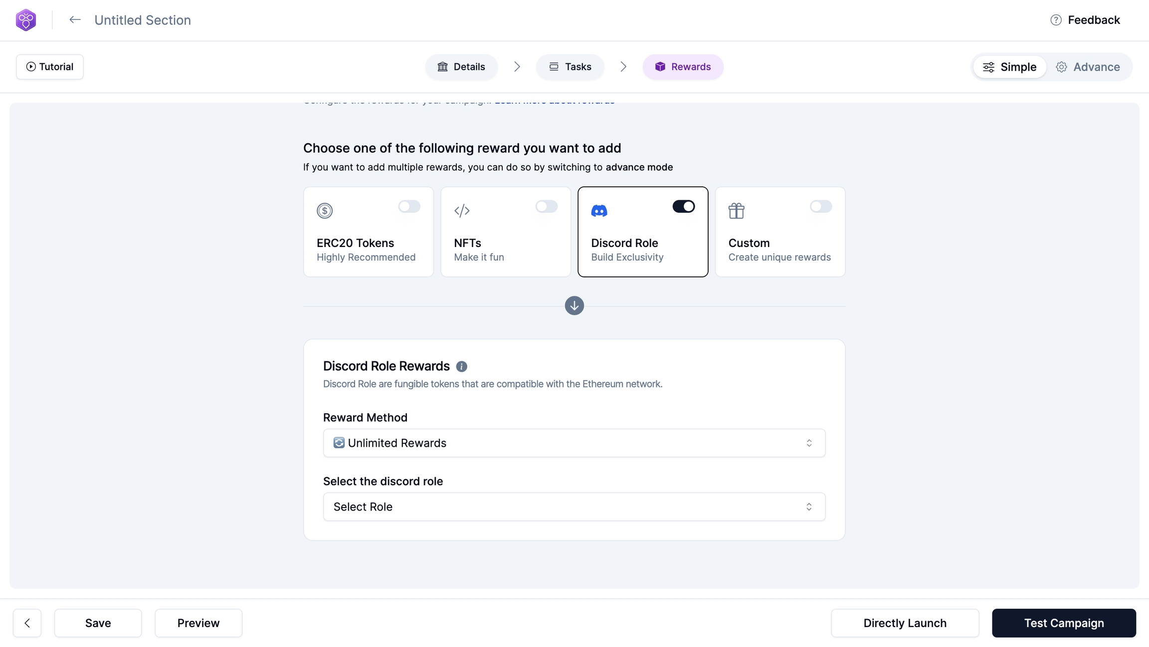 Once you are done setting up the tasks you will need to set rewards fro your campaign. You can set one or multiple rewards. You can choose to rewards users with ERC20 tokens(users love this cuz 🤑🤑🤑), NFTs, Discord Roles or you can make your own custom reward.