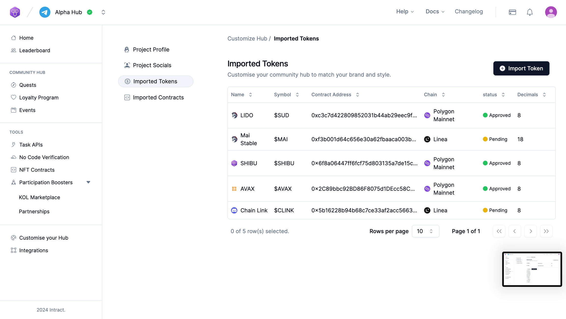 If you want to reward your users with tokens that are not already in our token menu, you can import them. Once the tokens are imported, you can manage them from your hub, editing and deleting them as desired.